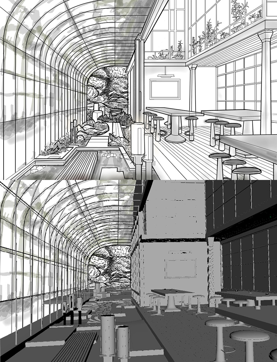 2: A text in Maya using a bit of python coding to automate alignment. The match could be a bit better. I created a line drawing that is simple an extension of this garden.
